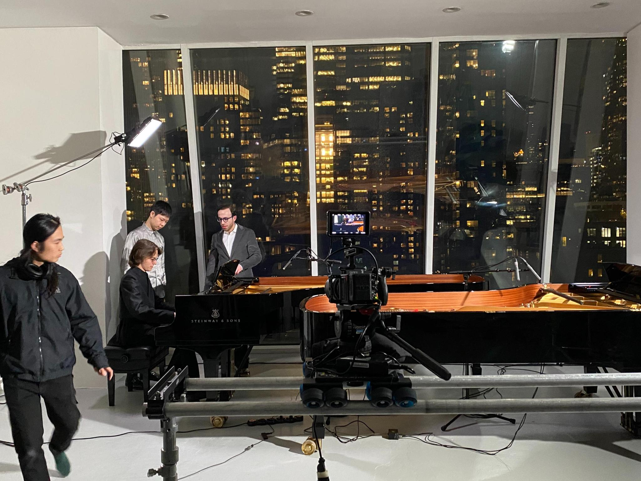 On November 5, 2025 three pianists -- Han Chen, Arseniy Gusev and Nicolas Namoradze -- recorded excerpts from the piece using two pianos. Video artist Huei Lin at left.